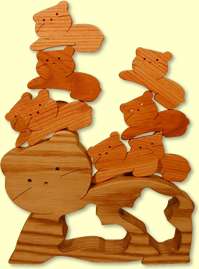 こ〜んな感じで子クマを親クマに積んで遊びます。バランスを取ってうまく積み上げるのは、なかなか難しいんですよ。対象年齢は3歳から大人までOK。木のおもちゃとしても、お部屋のインテリアとしても楽しめます。