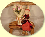 この作品は、実に三つの偶然から生まれました。「ポエム」にいつも来店下さっている大工のお客様から「流木のベンチ」をいただいて、そこにポエム人形(私ね)が座ってみたらちょうど良かったのね。それでしばらくそこに座っていたら今度はアートフラワーをなさっている違うお客様から「花束」をいただいちゃったの!それでこの3点の偶然から今回の作品が生まれましたとさ(ё_ё)