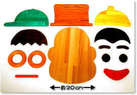 じゃ〜ん!これが私のお店で一番人気の、木で作った「ふくわらい」です。14のパーツセットで、子供から大人までみんなで楽しめます。珈琲を買いに来たお客様は、見本でしばらく遊んでから「子供と一緒にあそぼ」といって買っていかれます(^,^)
